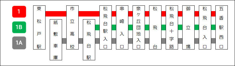 | 1B | 松飛台駅 ~ 松飛台十字路 ~ 五香駅西口 | 運行回数 運行時刻 終発時刻 |